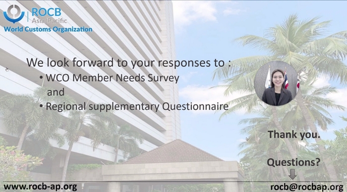 The main purpose of the video presentation produced by the ROCB A/P is to inform and facilitate three essential topics. First, to let Members be familiarized with the new Capacity-Building Paradigm and understand the importance of the change relating to the WCO Member Needs Survey. Second, to introduce the new Regional Questionnaire initiated by the ROCB A/P, in collaboration with Region’s Capacity Building co-coordinator, Japan Customs, and its significant role in helping Members’ needs to reach WCO more effectively. Finally, to inform new procedural changes for each workshop.