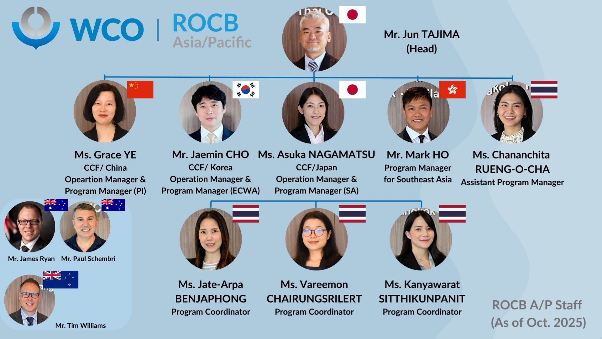 As of January 2025, the ROCB A/P has nine full-time seconded staff members, as shown in organizational chart above. The ROCB A/P has a Head, four Program Managers, an Assistant Program Manager and three Program Coordinators, who are seconded from China Customs, Hong Kong Customs, Japan Customs (including the Head of the ROCB A/P), Korea Customs and the Thai Customs. The ROCB A/P would like to extend its profound appreciation to the Customs Administrations mentioned for seconding officials.