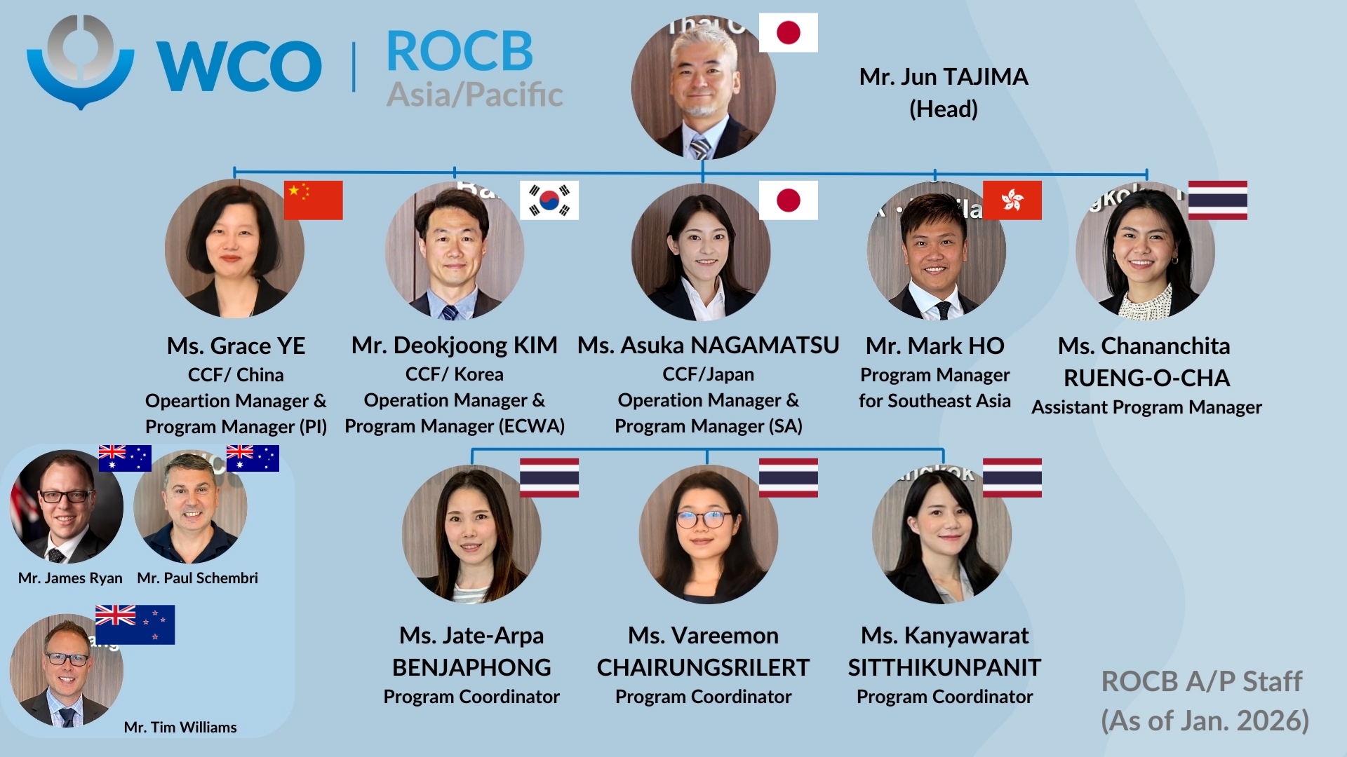 As of January 2025, the ROCB A/P has nine full-time seconded staff members. The ROCB A/P has a Head, four Program Managers, an Assistant Program Manager and three Program Coordinators, who are seconded from China Customs, Hong Kong Customs, Japan Customs (including the Head of the ROCB A/P), Korea Customs and the Thai Customs. The ROCB A/P would like to extend its profound appreciation to the Customs Administrations mentioned for seconding officials.