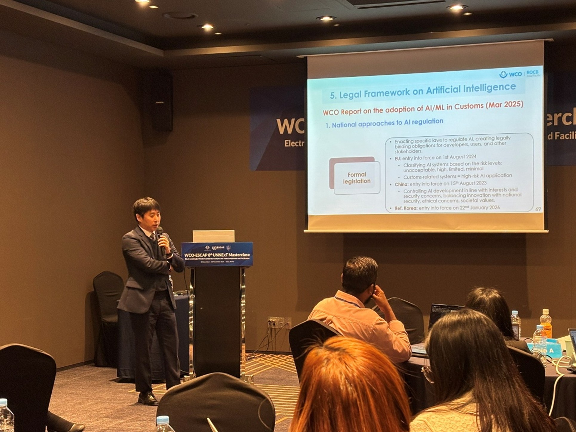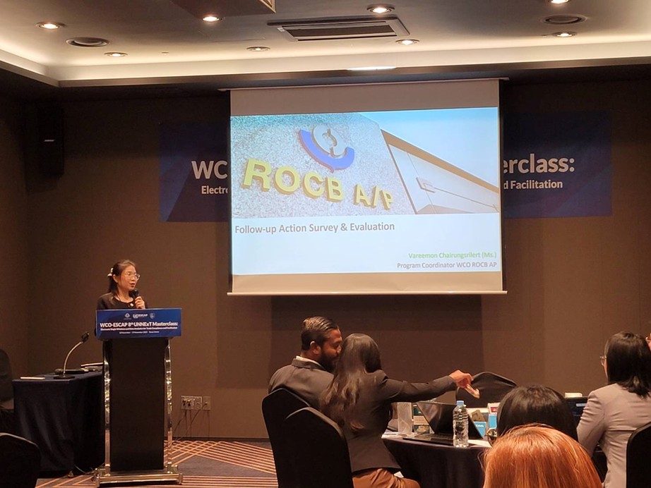 Mr. Jaemin Cho, Program Manager of ROCB A/P, and Ms. Vareemon Chairungsrilert, Program Coordinator, facilitated the workshop. Mr. Jaemin Cho presented the legal frameworks for Electronic Single Window and AI systems, while Ms. Vareemon Chairungsrilert presented ROCB A/P’s work programme and handled the evaluation session.