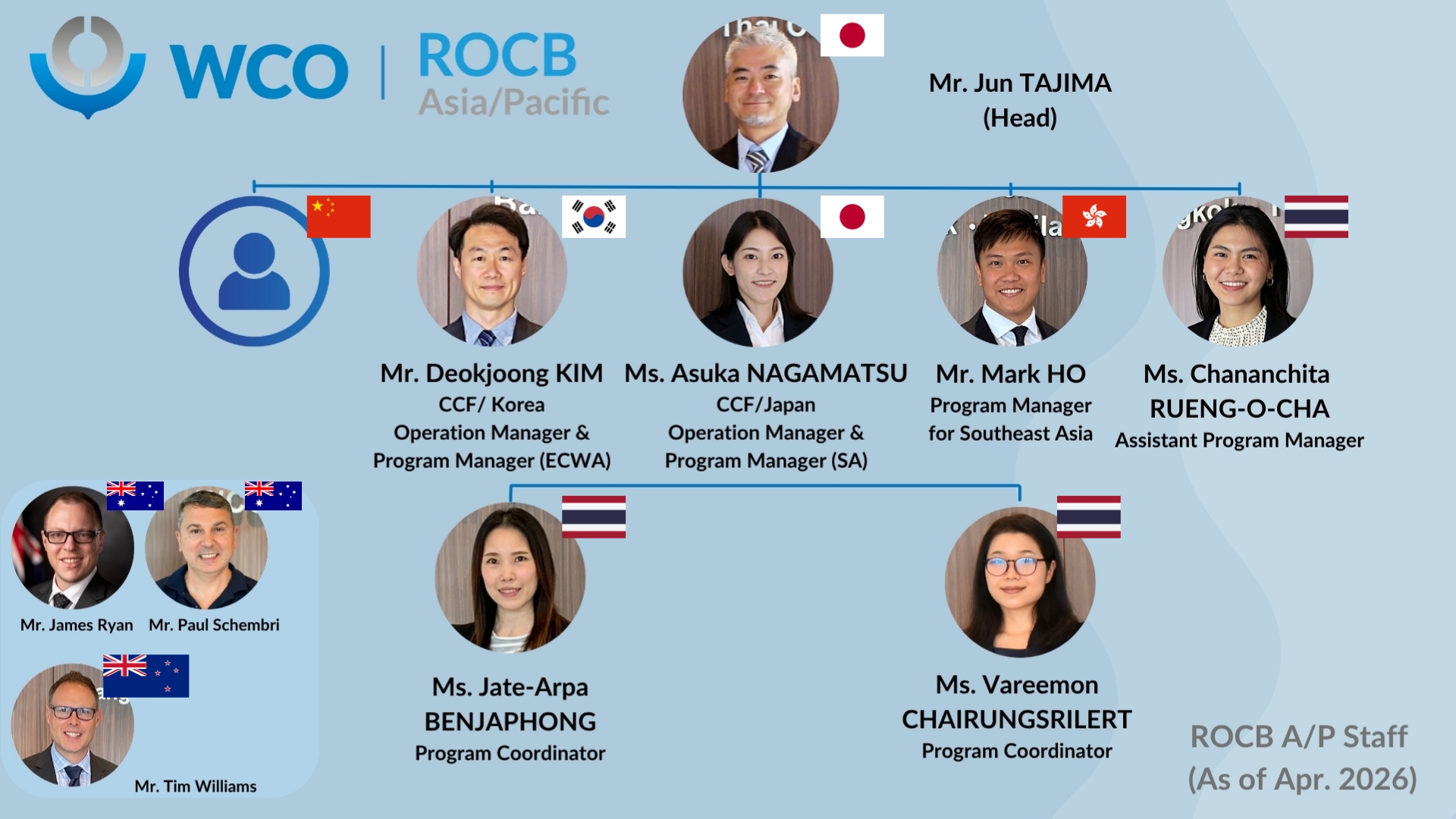 As of January 2025, the ROCB A/P has nine full-time seconded staff members, as shown in organizational chart above. The ROCB A/P has a Head, four Program Managers, an Assistant Program Manager and three Program Coordinators, who are seconded from China Customs, Hong Kong Customs, Japan Customs (including the Head of the ROCB A/P), Korea Customs and the Thai Customs. The ROCB A/P would like to extend its profound appreciation to the Customs Administrations mentioned for seconding officials.